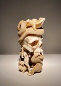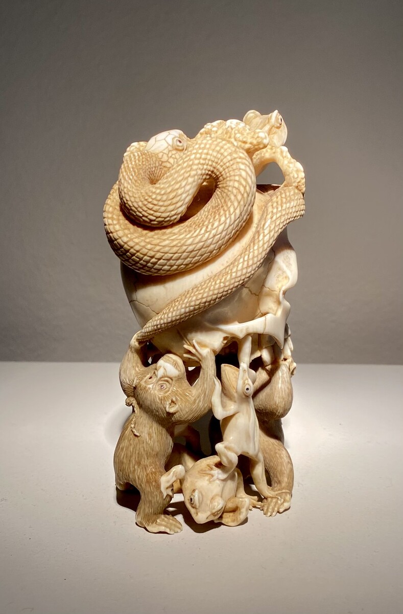 A very fine 19th. century carved Ivory Okimono representing a skull adorned with a snake and frog suggests a memento mori theme .