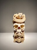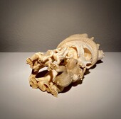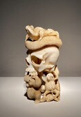 A very fine 19th. century carved Ivory Okimono representing a skull adorned with a snake and frog suggests a memento mori theme .